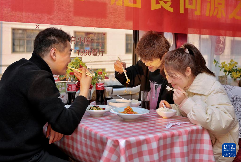1月17日,乘客在K212次列车餐车上用餐。