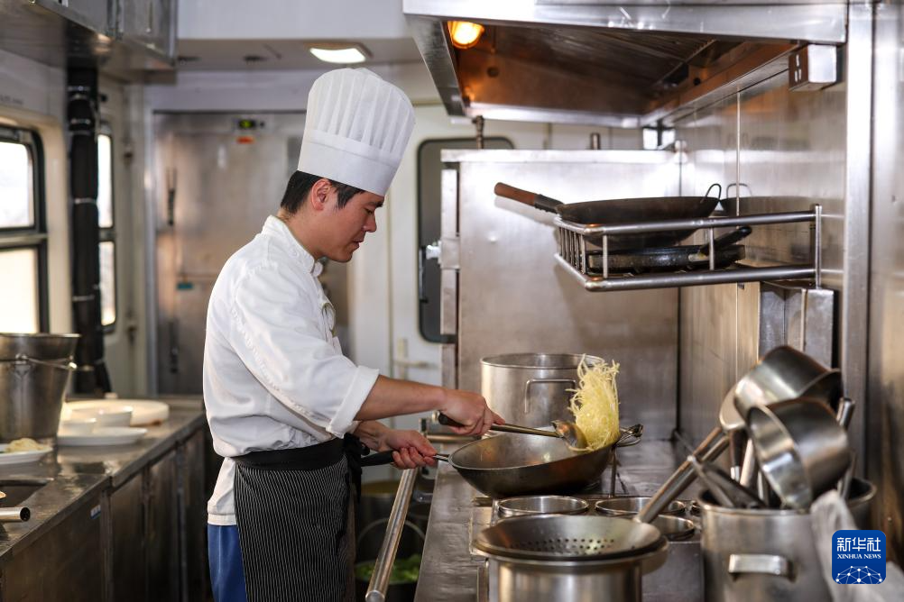 1月17日,铁路杭州客运段甬广车队炊事员王利茂在K212次列车餐车上烹饪菜肴。