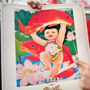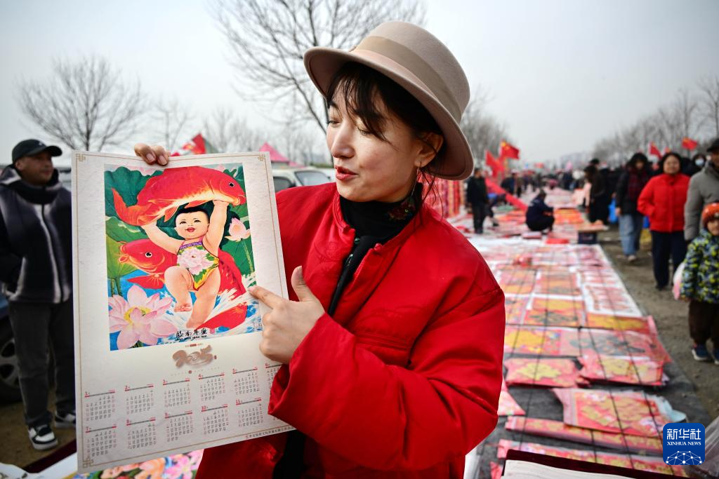 1月18日,一名摊主在泊里大集上推销传统年画。