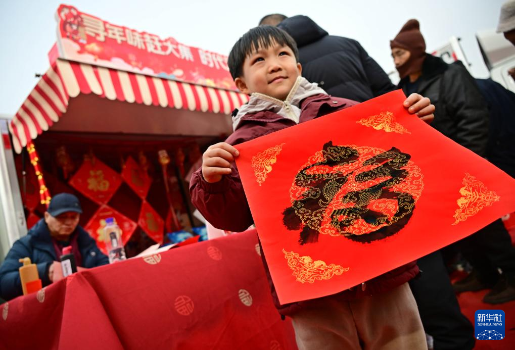 1月18日,一名小男孩在泊里大集非遗互动区领取福字。