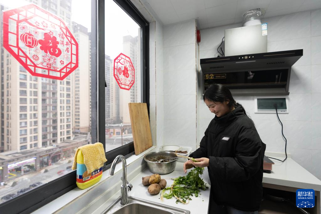 1月16日,一名刚搬入新家的受灾村民在厨房里做饭。