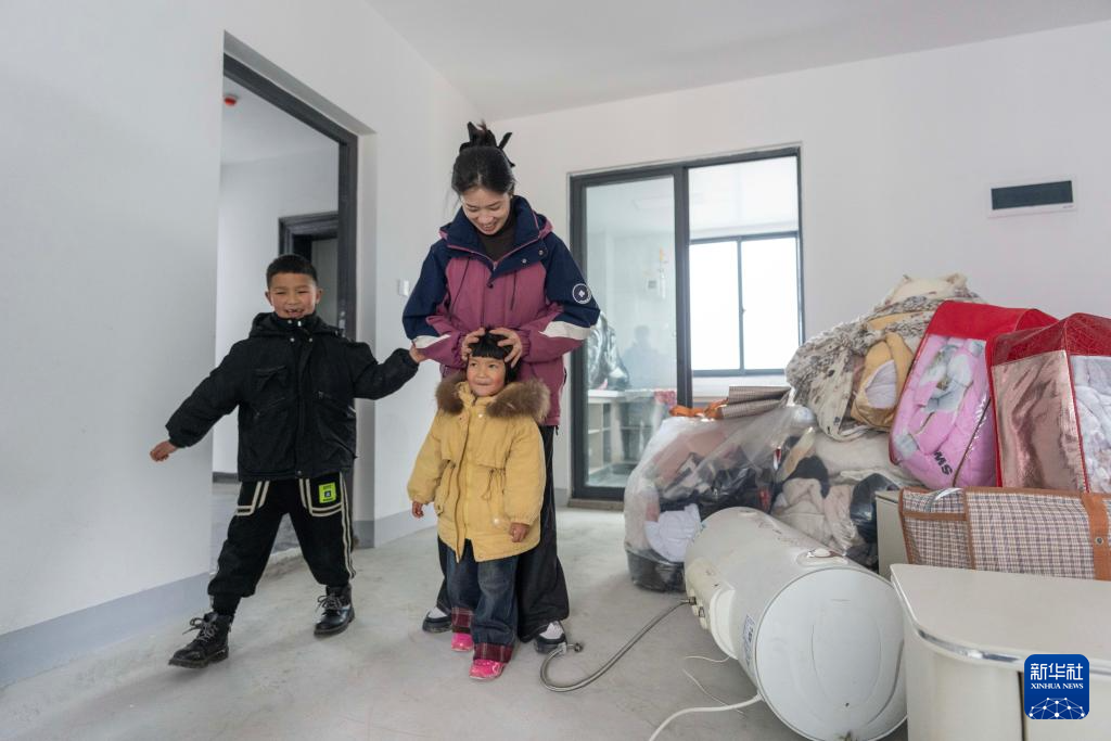 1月16日,受灾村民和孩子在雄俊园小区的新家内。