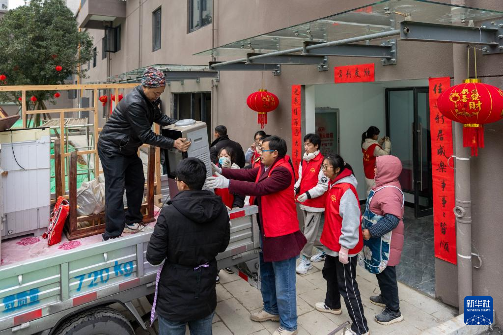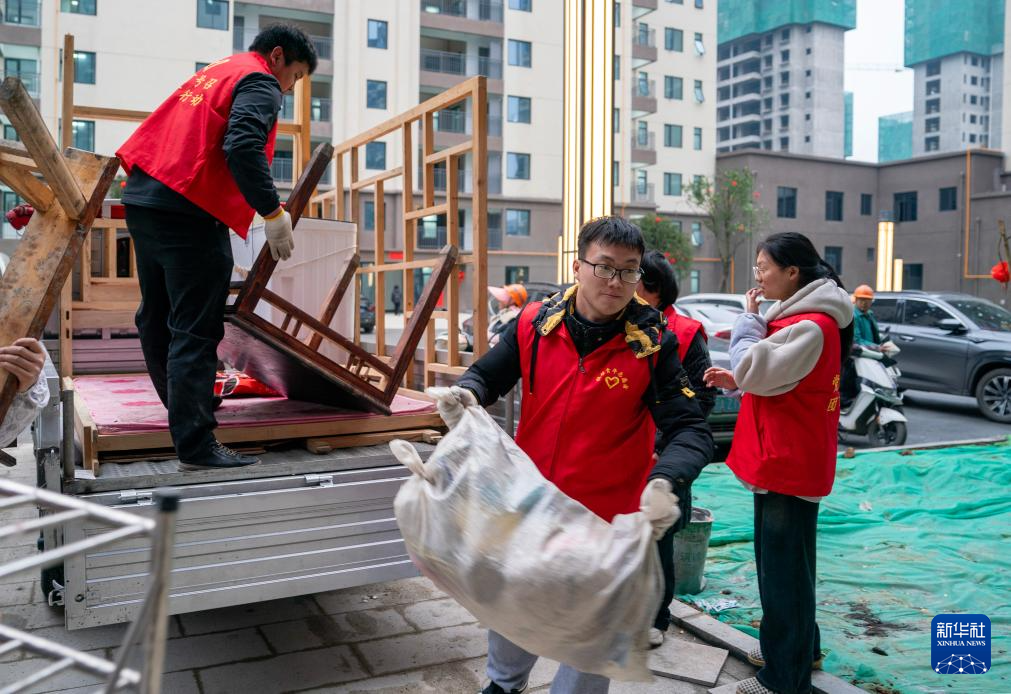 1月16日,志愿者在雄俊园小区帮助受灾村民搬家。