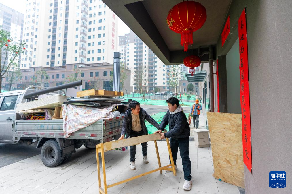 1月17日,受灾村民搬运家具准备入住雄俊园小区的新家。
