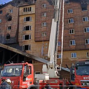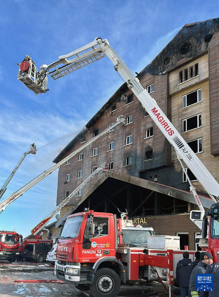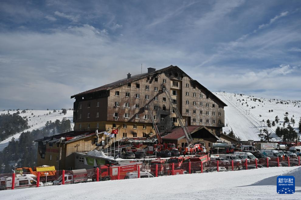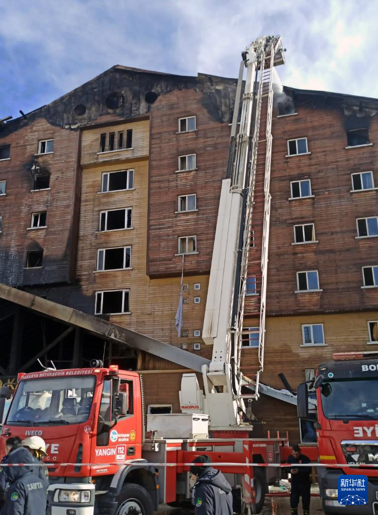 1月21日,在土耳其西北部博卢省的卡塔尔卡亚滑雪中心,消防车辆在发生火灾的酒店进行灭火作业。