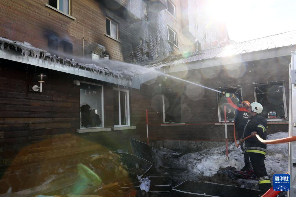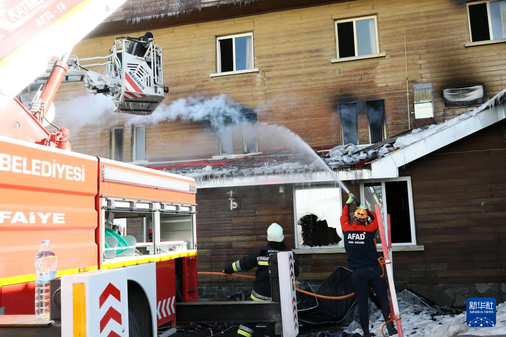 1月21日,在土耳其西北部博卢省的卡塔尔卡亚滑雪中心,消防员在发生火灾的酒店灭火。