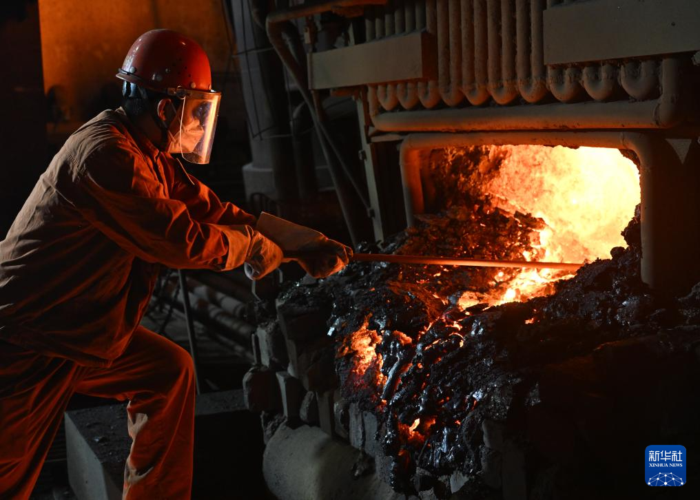1月21日,工人在初炼炉前进行吹氧作业。