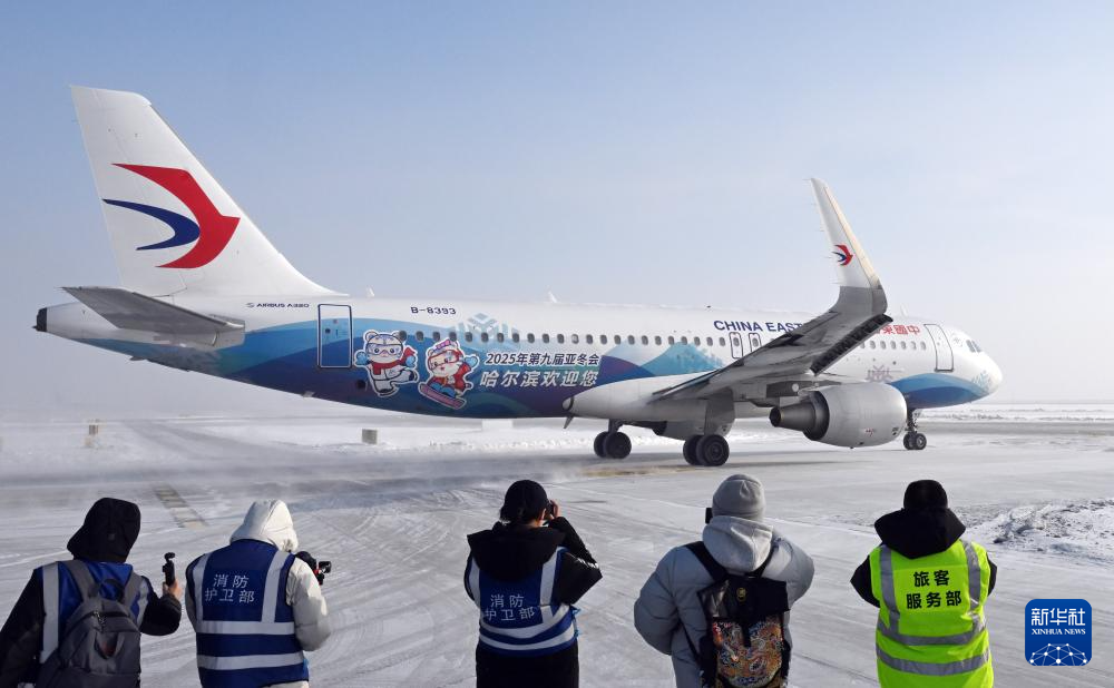 1月23日,东航MU5616航班“亚冬号”主题彩绘飞机在哈尔滨机场新建东二跑道上滑行准备起飞。