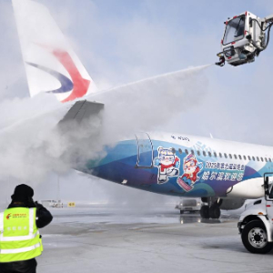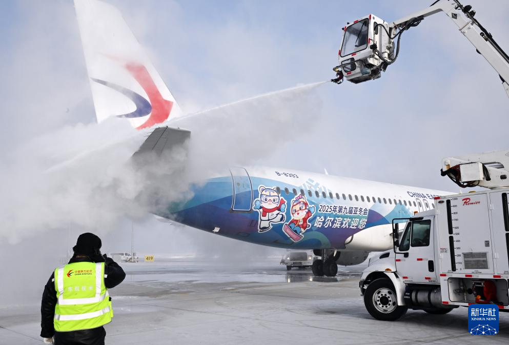 1月23日,东航MU5616航班“亚冬号”主题彩绘飞机起飞前除冰。