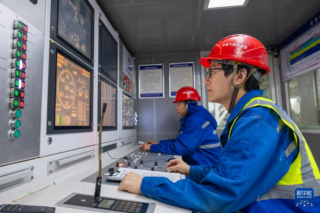 在芜湖龙湾长江隧道,中铁十四局工作人员在观察盾构机作业状况(1月16日摄)。