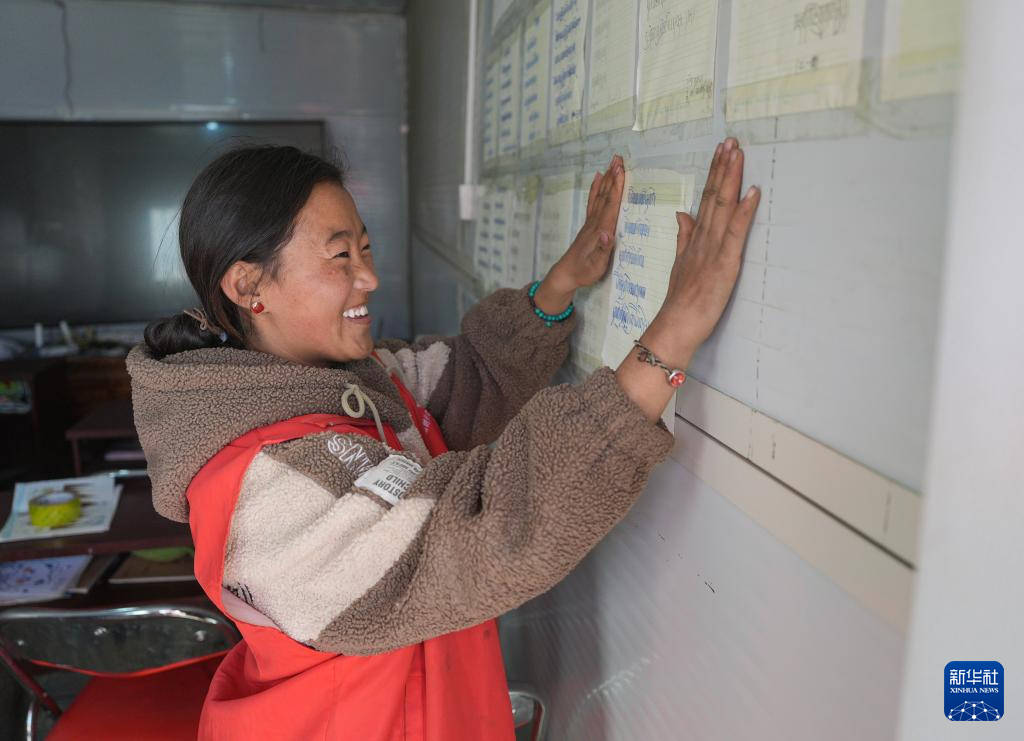 1月25日,西藏职业技术学院学生白玛贵桑在定日县曲洛乡热木青村安置点板房张贴孩子们的藏文书法作品。