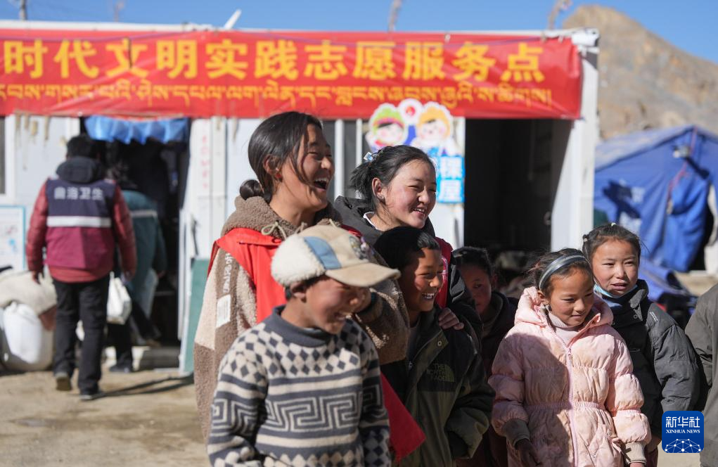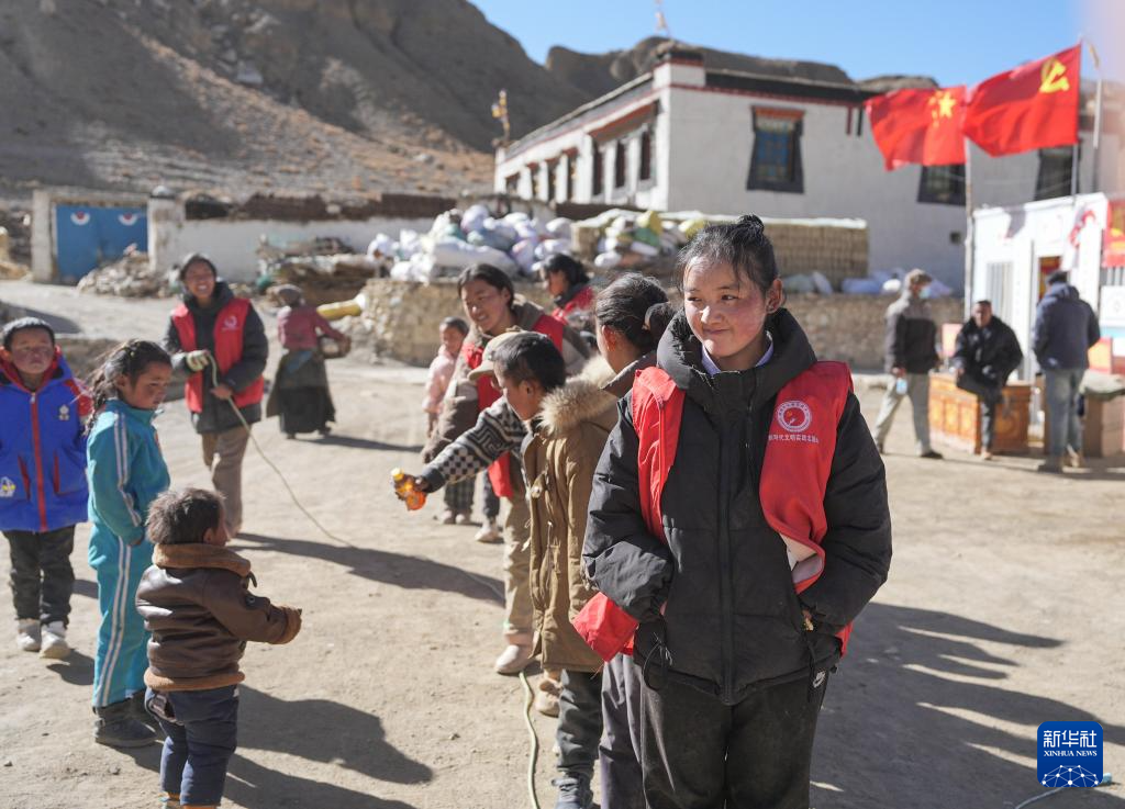 1月25日,大学生志愿者在定日县曲洛乡热木青村安置点和孩子们一起跳绳。
