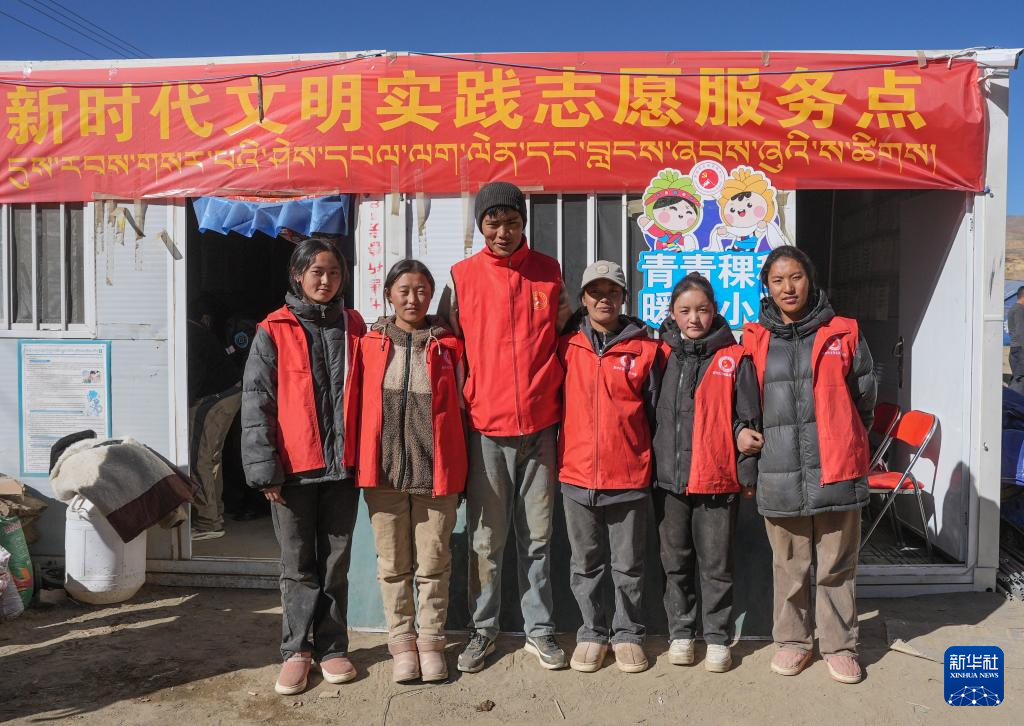1月25日,大学生志愿者在定日县曲洛乡热木青村安置点板房前合影。