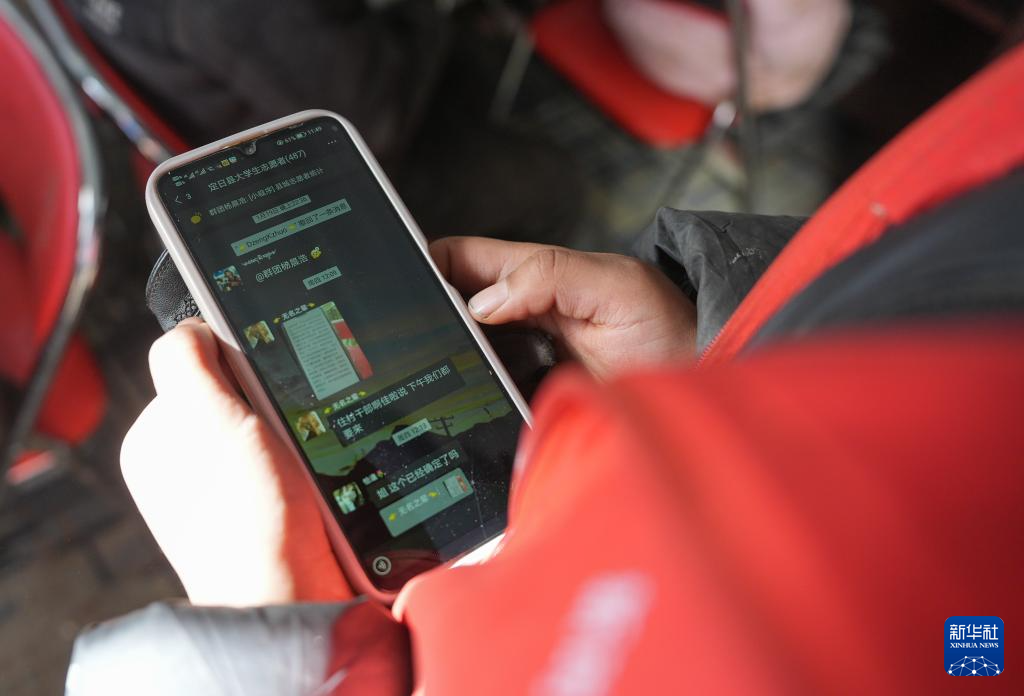 1月25日,大学生志愿者在定日县曲洛乡热木青村安置点查看微信群信息。