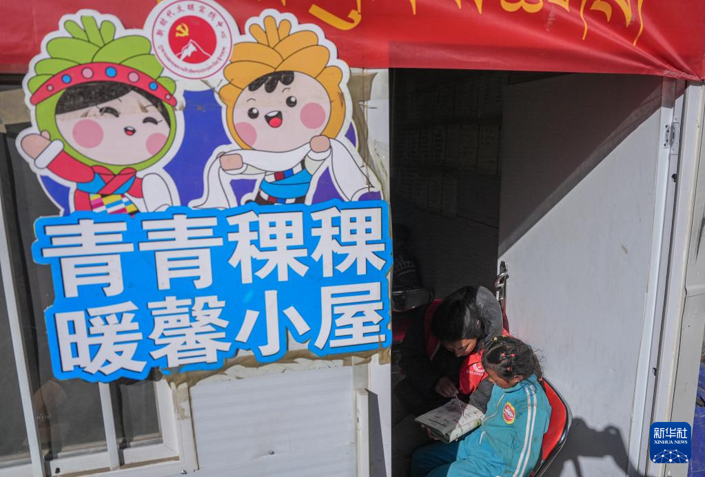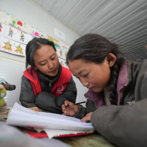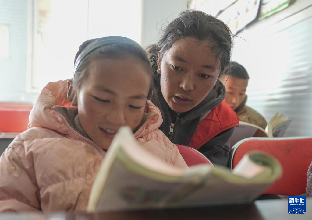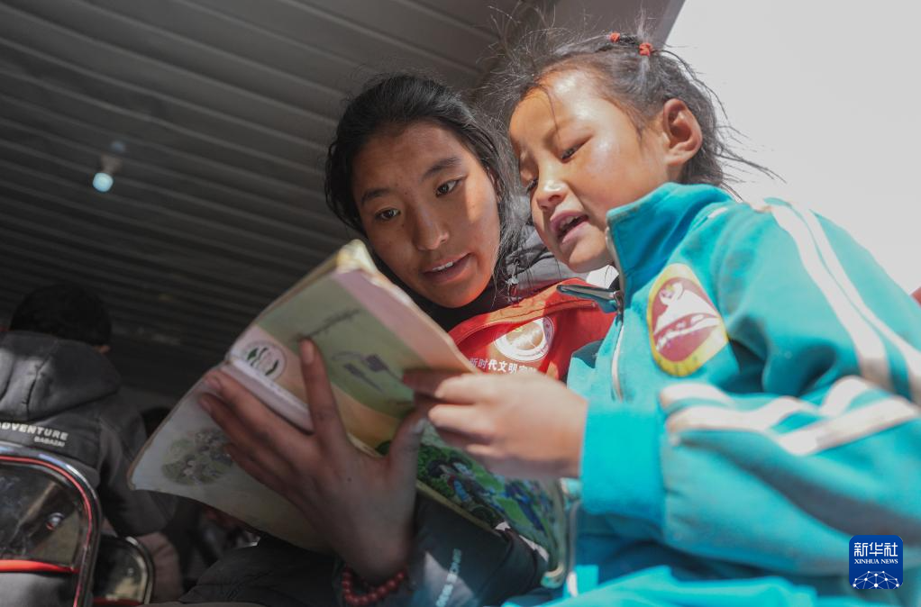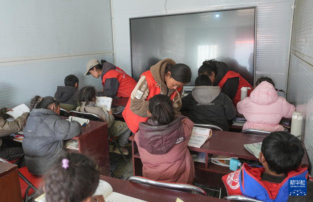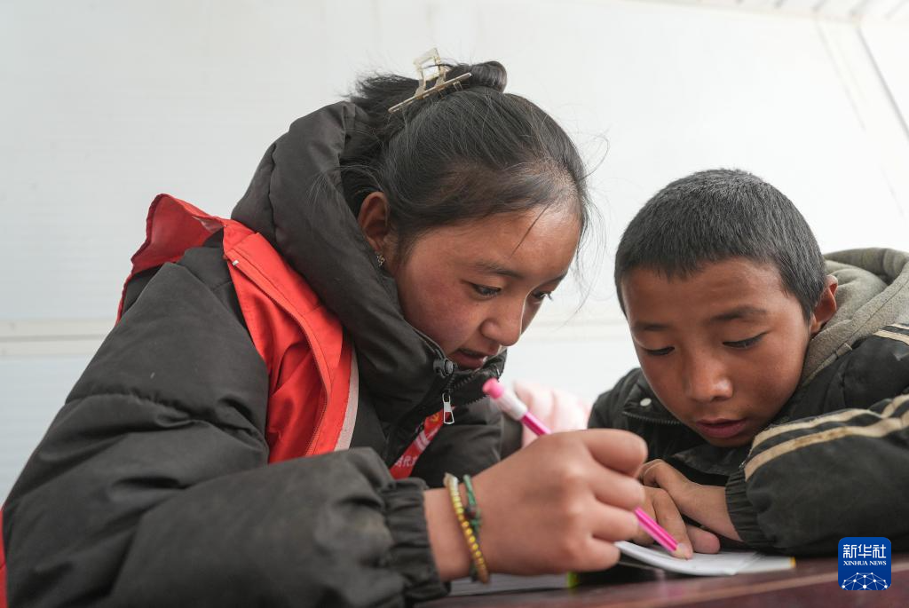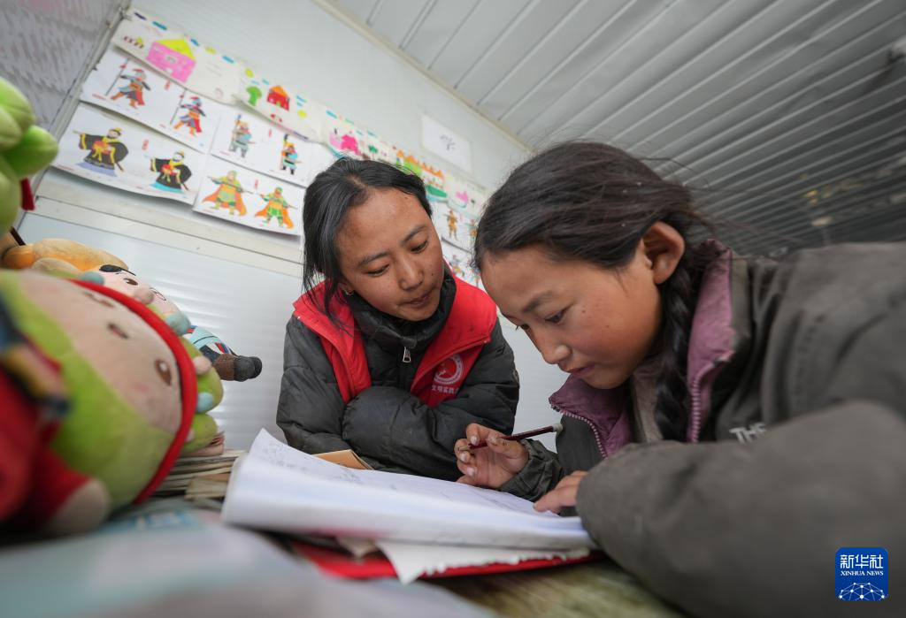 1月25日,青海师范大学学生巴桑卓玛(左)在定日县曲洛乡热木青村安置点为学生辅导作业。