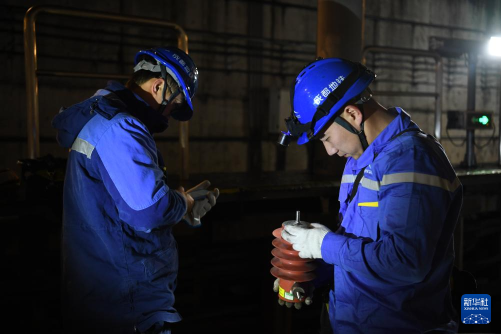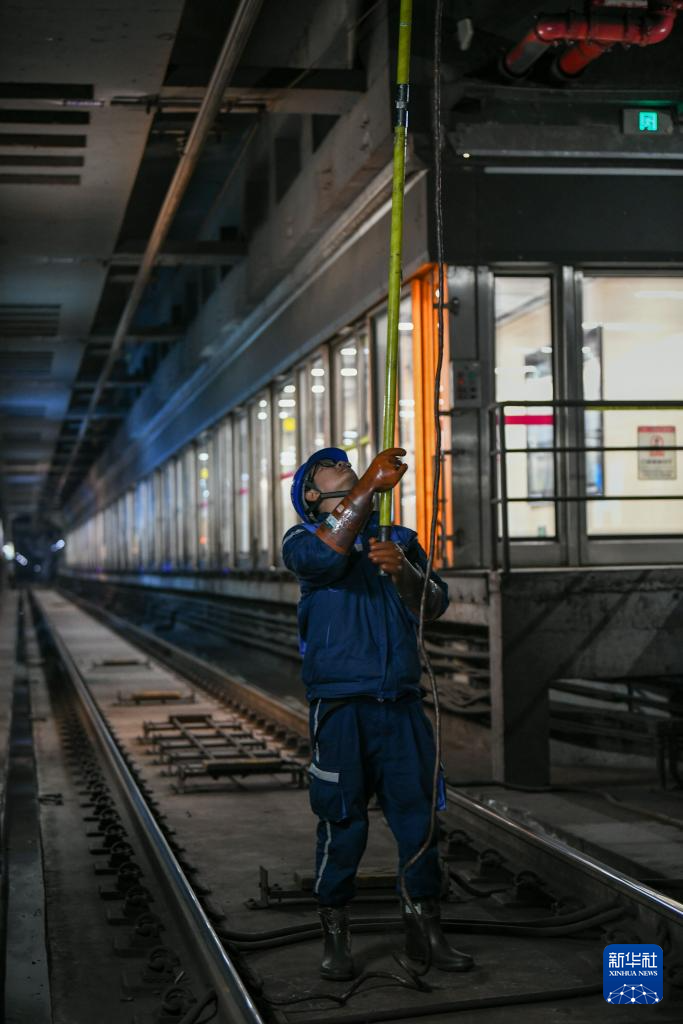 1月26日凌晨,成都地铁北郊接触网2班工作人员曾吕帅在更换避雷器。
