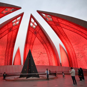 1月28日,巴基斯坦首都伊斯兰堡的国家纪念碑亮起红色灯光。