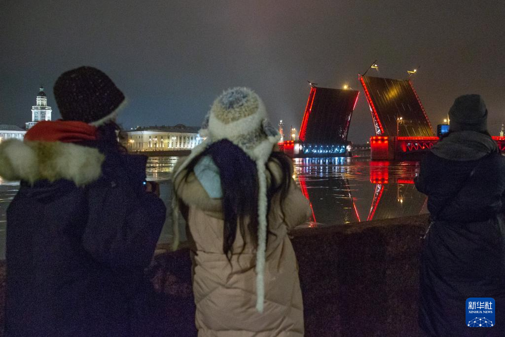 1月29日凌晨,在俄罗斯圣彼得堡,人们在涅瓦河畔观看亮起“中国红”的冬宫桥开桥。冬宫桥29日凌晨在传统中国乐曲《春节序曲》的旋律中开桥。这是冬宫桥首次以伴有音乐的开桥形式庆祝中国农历新年。