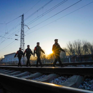 1月29日,太原铁路公安局秦皇岛公安处遵化北站公安派出所的民警在河北省遵化市境内的大秦铁路巡逻。