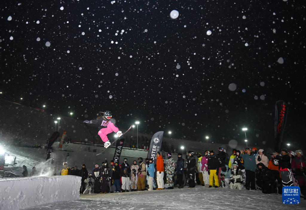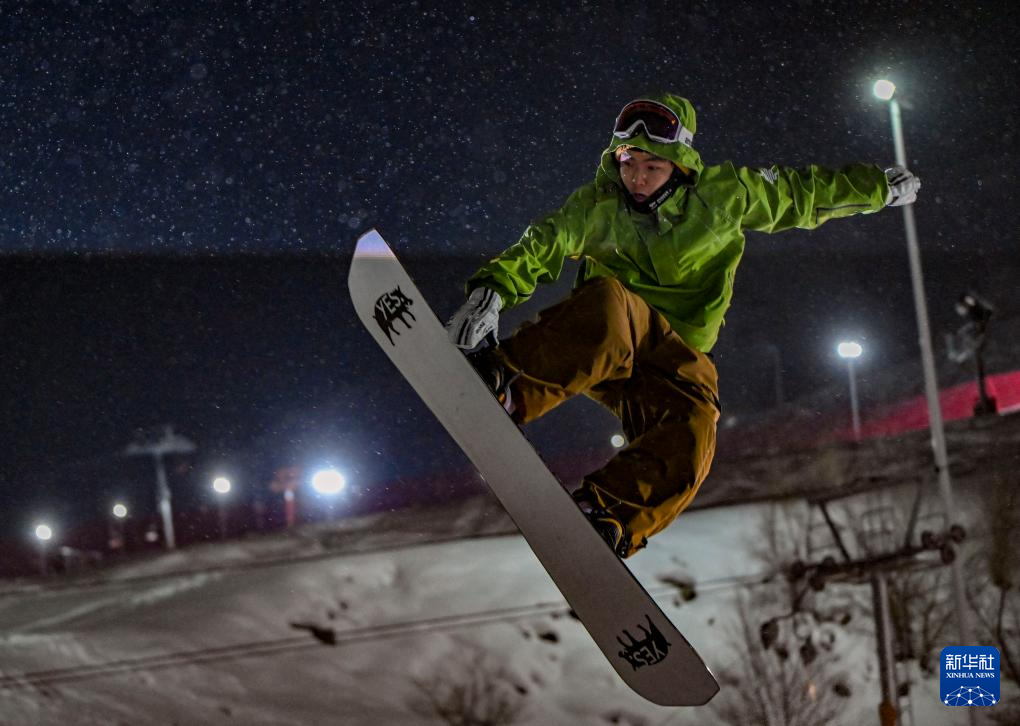 农历除夕当天,雪友在滑雪公园飞越跳台(1月28日摄)。