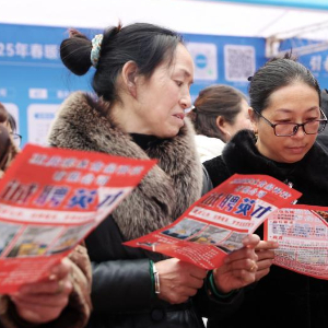 2月5日,求职者在南通市2025年新春大型公益招聘会上咨询岗位信息。