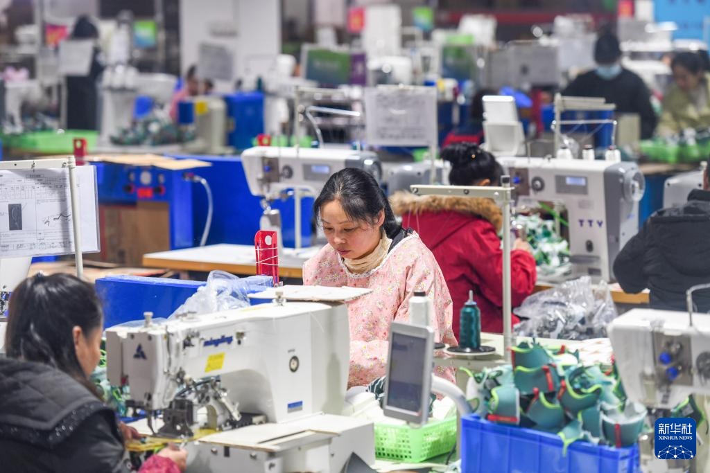 2月5日,工人在湖南省永州市道县高新技术产业开发区一家运动用品企业生产线上作业。