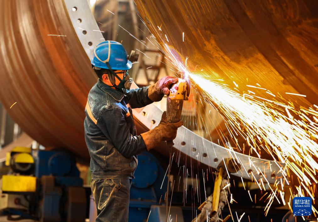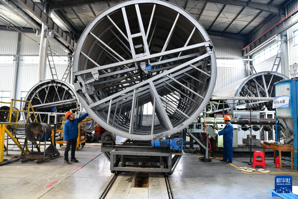 2月5日,江苏省连云港经济技术开发区一家风力设备公司工人在车间内生产风电塔架。