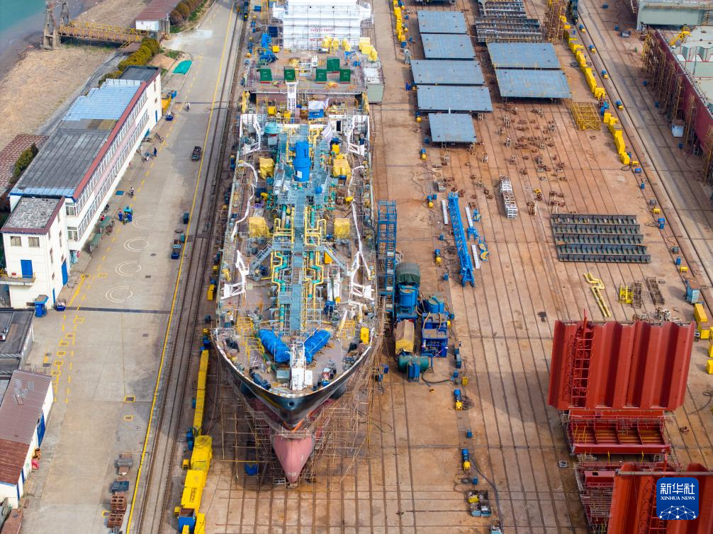 2月5日,工人在位于江苏南京的招商工业南京金陵船厂赶制船舶订单(无人机照片)。