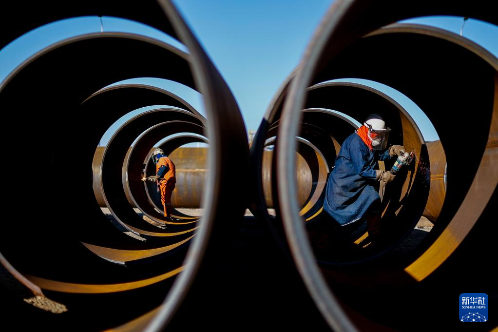 2月5日,工人在海油工程天津智能化制造基地进行钢材预制作业。