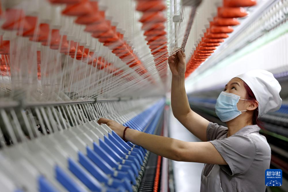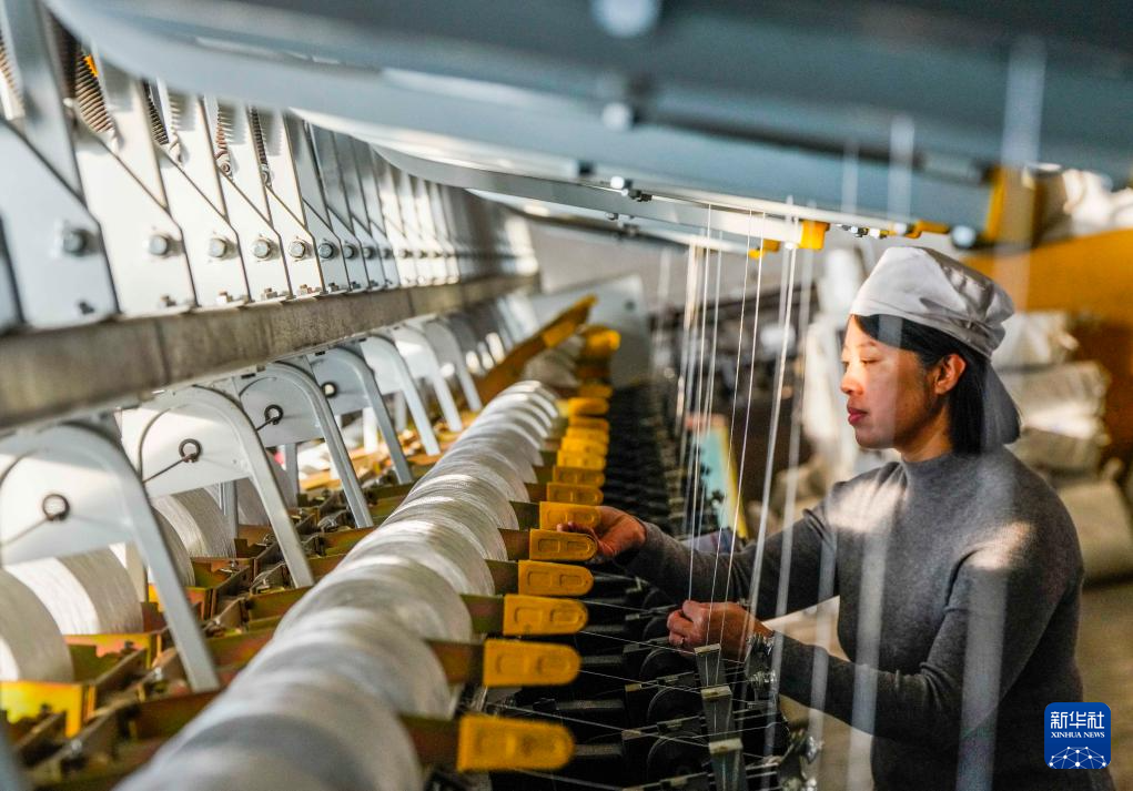 2月5日,山东枣庄经济开发区一家企业工人在加工高端纱线。