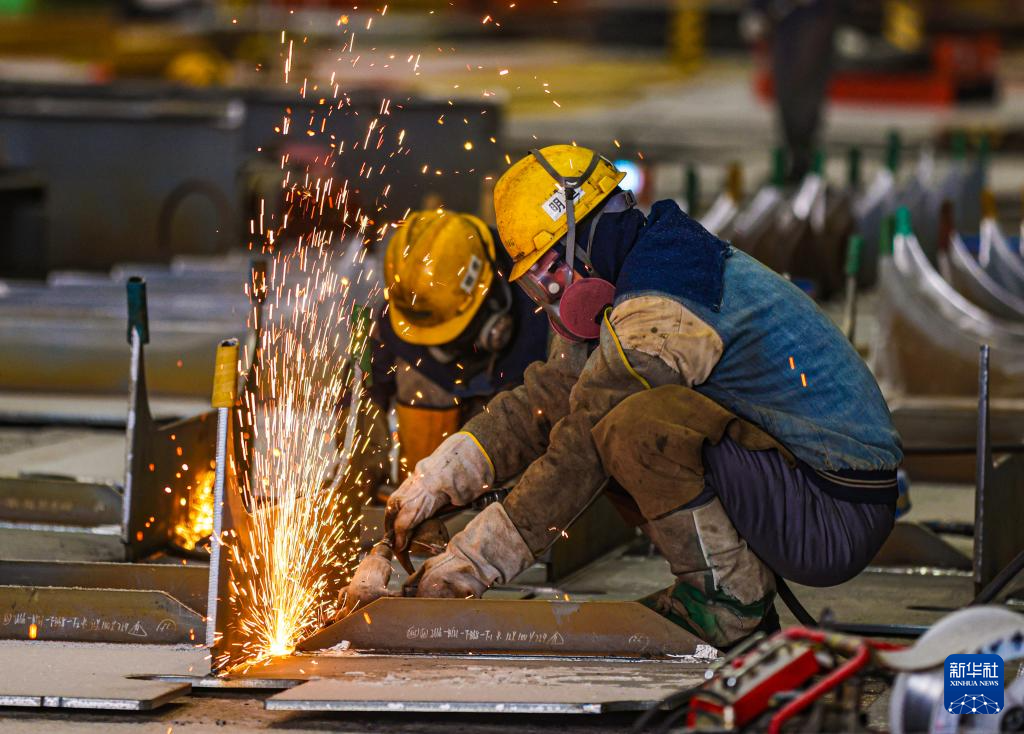 2月5日,山东省荣成市俚岛镇三星重工业(荣成)有限公司工人在车间作业。