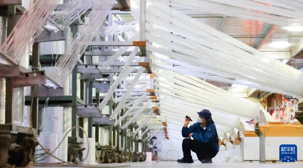2月5日,江苏省连云港经济技术开发区中复碳芯电缆科技有限公司工人在车间查看数字化玻璃纤维拉挤板材生产线运行情况。