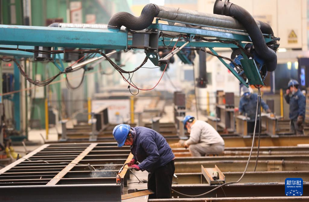 2月5日,山东省滕州市一家钢结构生产企业工人在车间内工作。