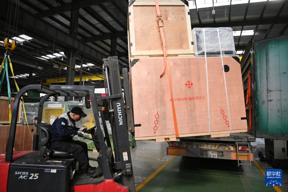 2月5日,天津市西青区张家窝镇久荣工业的员工在装运销往国外的设备。