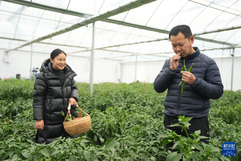2月6日,肖胜蓝(右)、贺小贞在宁乡市肖胜蓝家庭农场测试新种植辣椒品种的口感。