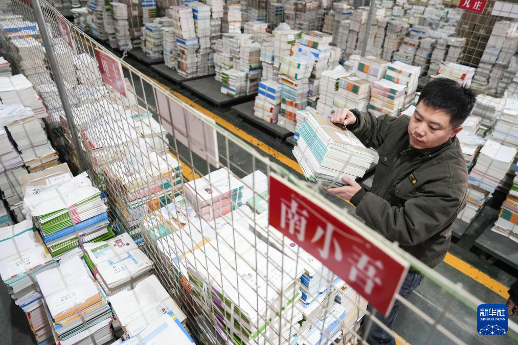 2月7日,在河南省商丘市夏邑县新华书店教材仓库内,工作人员在分拣中小学教材,准备送往各学校。