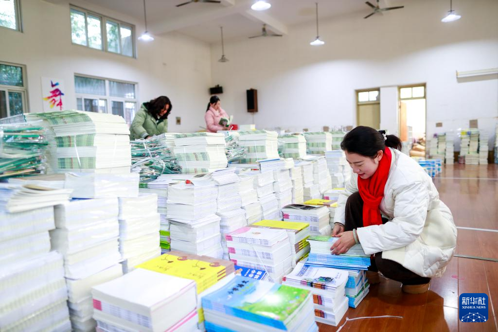 2月8日,江苏省兴化市景范学校的教师在整理、分发新学期教材。