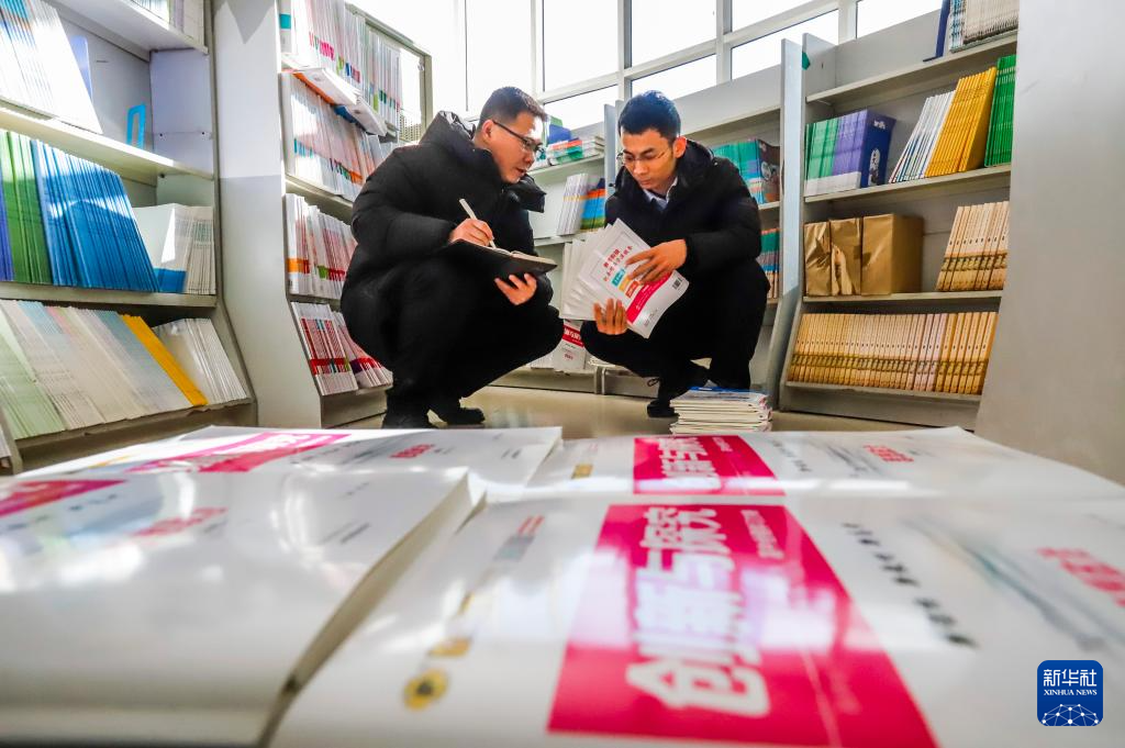 2月8日,工作人员在河北省石家庄新乐市新华书店仓库整理清点中小学教材,准备送往各学校。