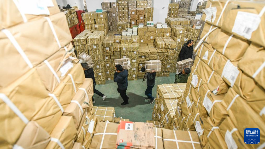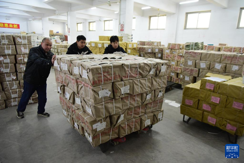 2月8日,工作人员在河北省石家庄市栾城区新华书店仓库搬运教材。