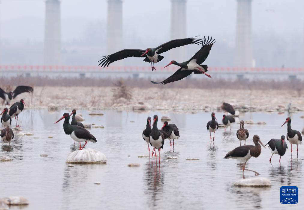 近日,成群的黑鹳、天鹅和野鸭子等水鸟飞抵河北省井陉县绵蔓河一带栖息觅食,形成一道靓丽的风景。近年来,井陉县持续推进生态环境治理,维护河湖生态平衡,吸引许多鸟类前来栖息。