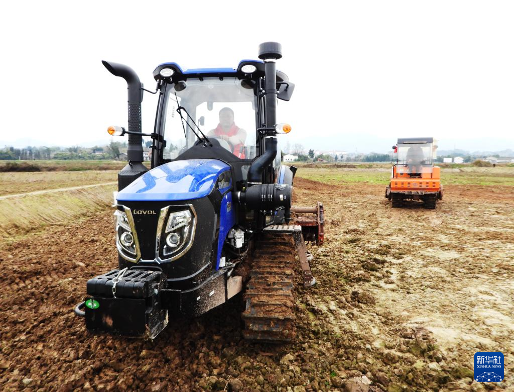 2月21日,在四川省达州市大竹县石河镇江水村,农民驾驶农机翻耕土地,准备播种玉米。