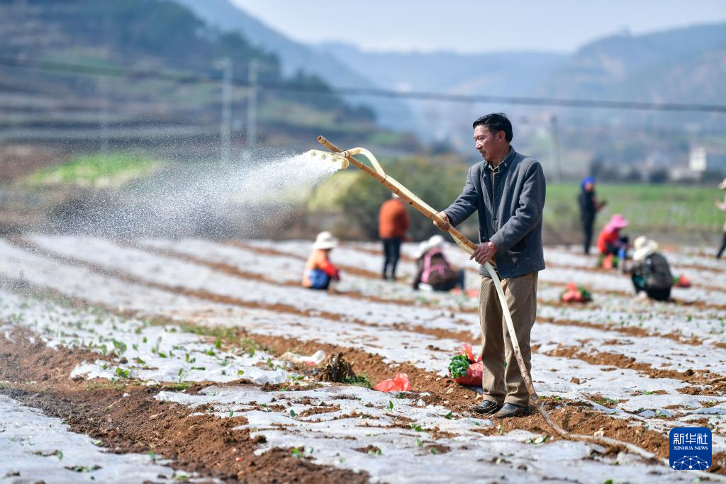 2月21日,农民在贵州省威宁县小海镇给新移栽的菜苗浇水。