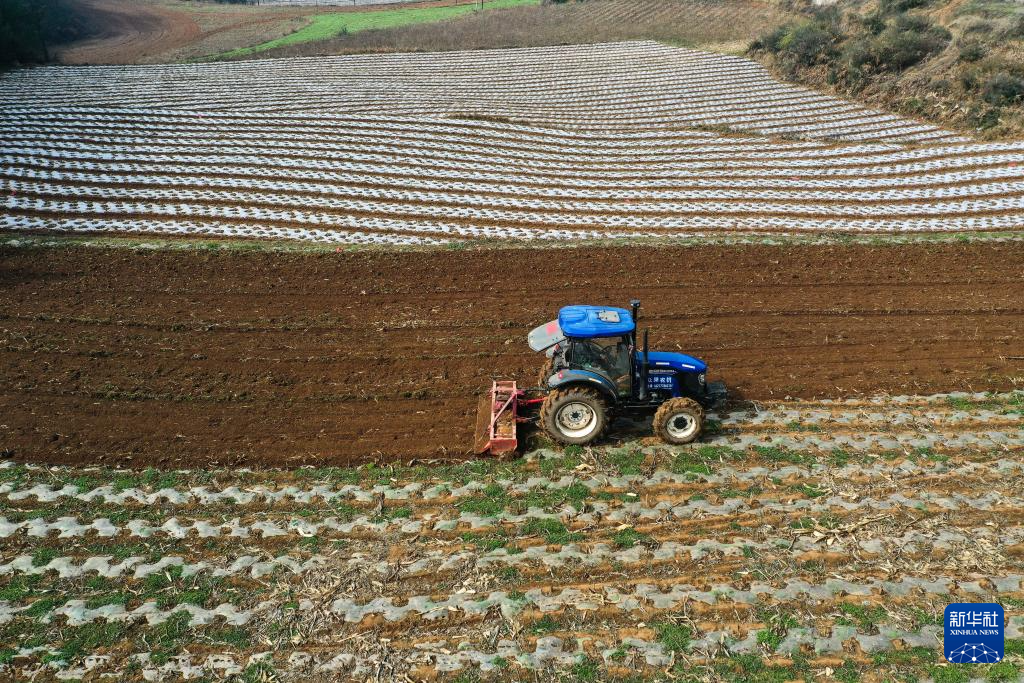 2月21日,在贵州省威宁县雪山镇银光村,毕节市农投机械服务有限公司的农机手驾驶农机帮助村民翻地(无人机照片)。