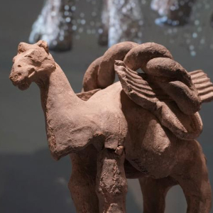 西部机场博物馆展出的北周文物彩绘陶载丝骆驼(2月26日摄)。