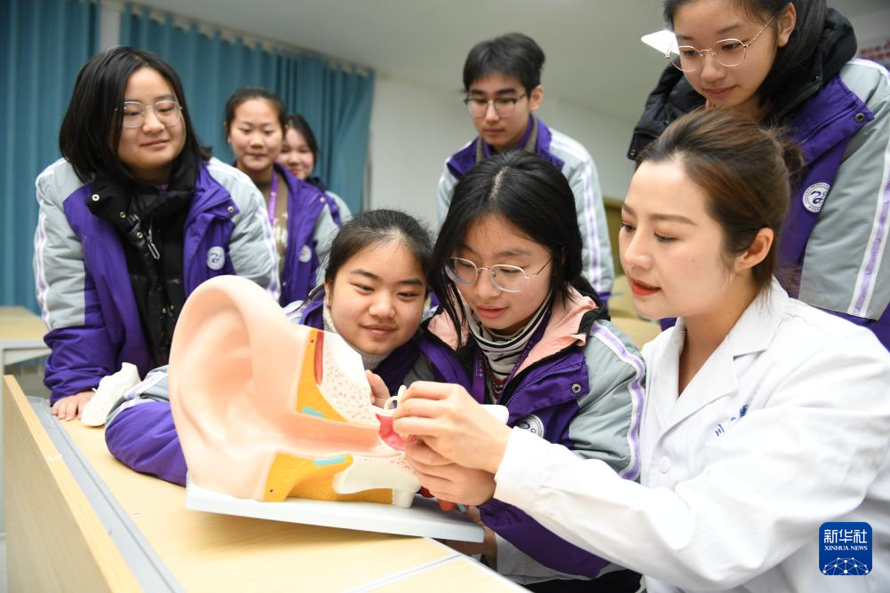 3月1日,在四川省南充高级中学临江校区,川北医学院附属医院的医师为同学们讲解耳朵构造及科学护耳知识。