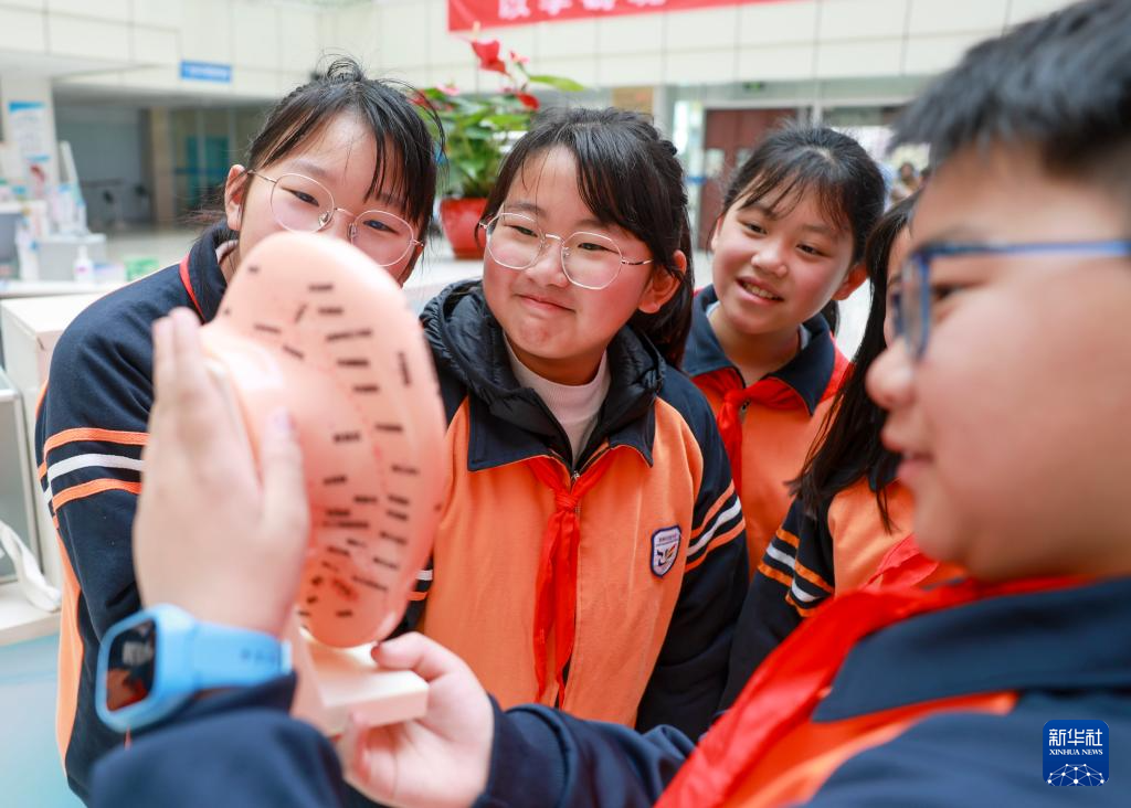 3月2日,在江苏省泰州市第四人民医院,泰州市实验小学教育集团育才路校区的学生在观看耳朵模型,了解耳朵结构。
