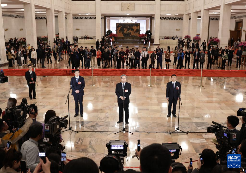 3月4日,全国政协十四届三次会议首场“委员通道”集体采访活动在北京人民大会堂举行。这是新华社记者在提问。