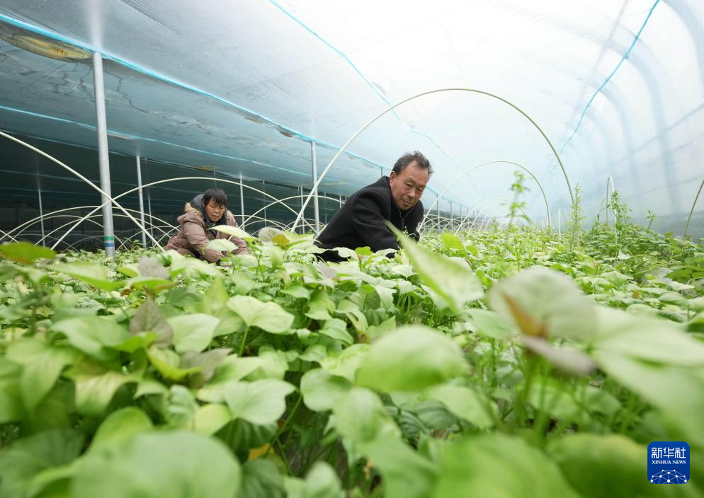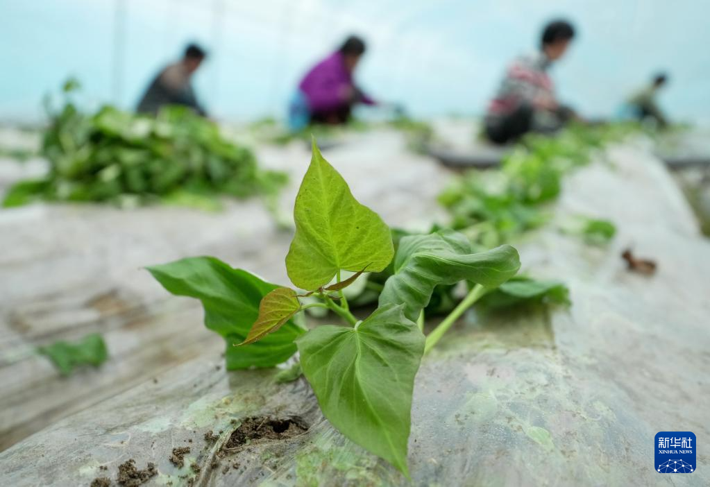 3月7日,在河北省行唐县南桥镇东安太庄村,一家红薯种植合作社的社员在大棚内管护脱毒红薯秧苗。