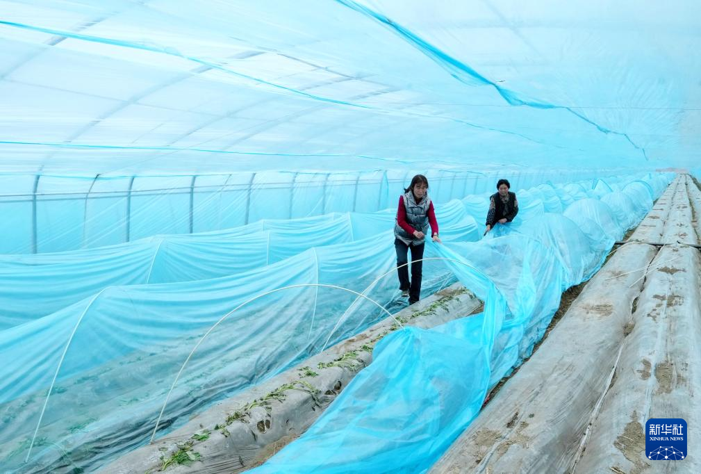 3月7日,在河北省行唐县南桥镇东安太庄村,一家红薯种植合作社的社员在扩繁大棚内给新栽植的脱毒红薯秧苗覆膜。