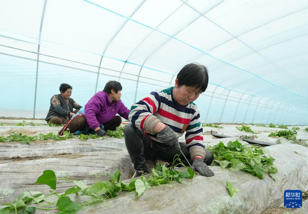 3月7日,在河北省行唐县南桥镇东安太庄村,一家红薯种植合作社的社员在扩繁大棚内栽植脱毒红薯秧苗。